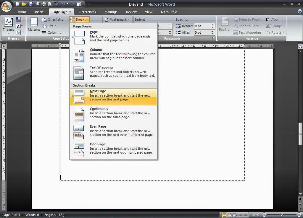 - Kemudian Click Tab " Page Layout - Breaks - Next Page "